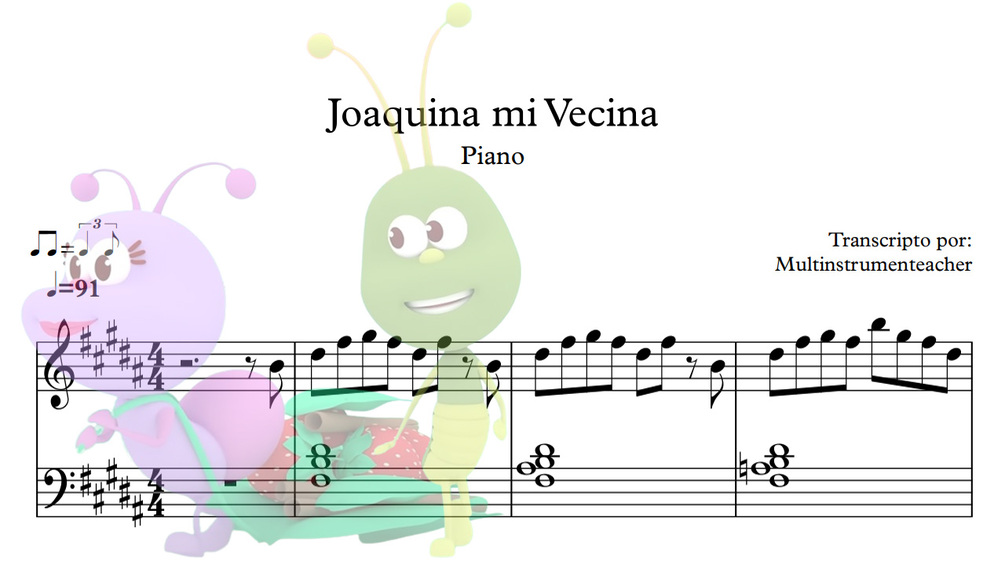 Obtendrás la partitura para piano de la canción "Joaquina mi vecina" de bichikids, el reino infantil, en archivo PDF, sin la marca de agua del dibujo.