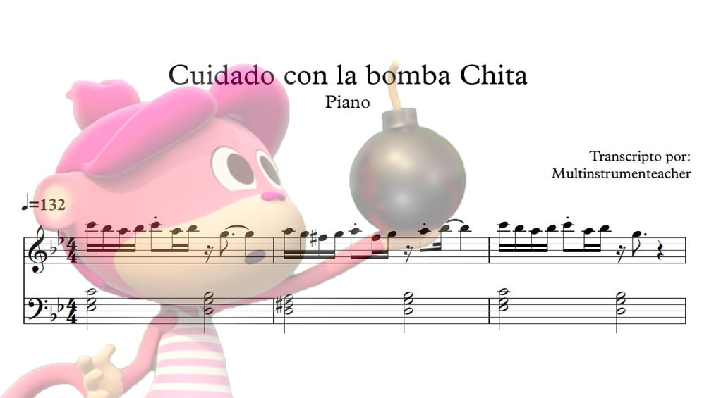 Obtendrás la partitura para piano de la canción "Cuidado con la bomba Chita" de Canciones del Zoo (El Reino Infantil) en archivo PDF, sin la marca de agua del dibujo.